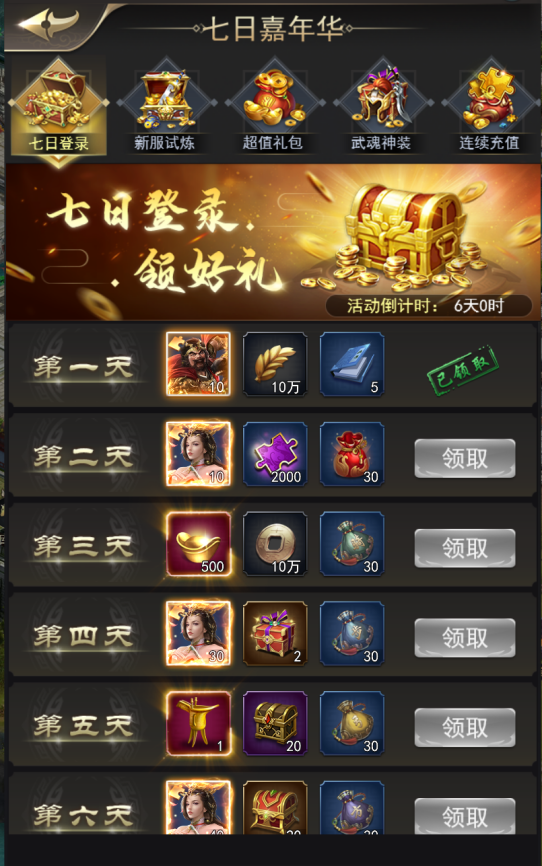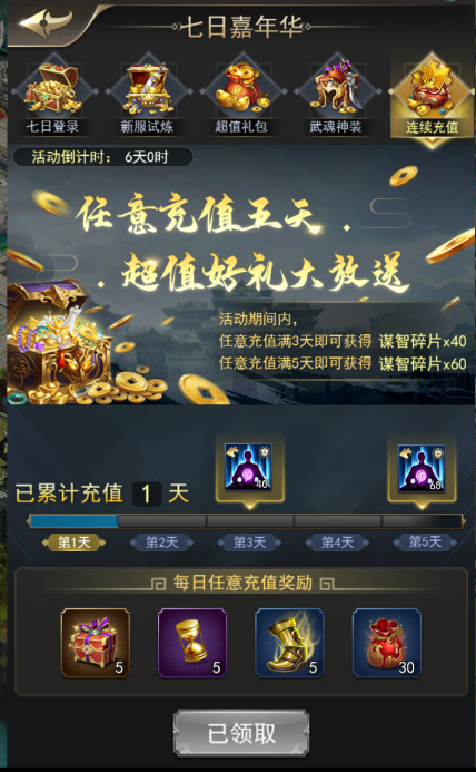 活动内容:活动期间内,每日充值任意金额即可领取奖励,任意充值五天,超值豪礼大放送。