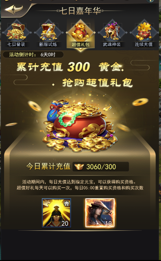 活动内容:活动期间内,每日充值达到指定元宝,可以获得购买礼包的资格。