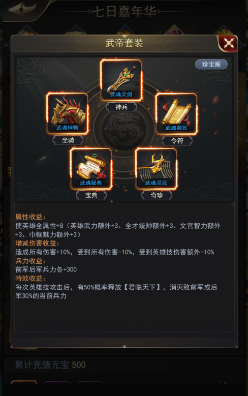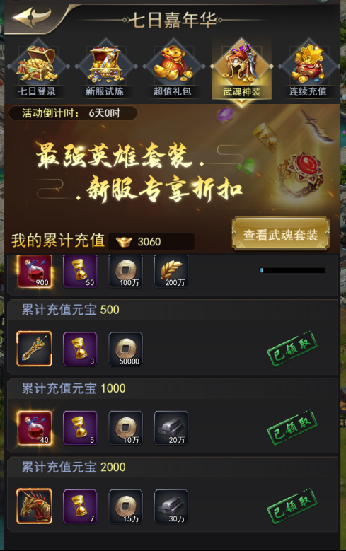活动内容:活动期间内,累计充值达到指定元宝,即可领取最强英雄套装。