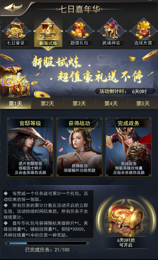 活动内容:完成指定的内容即可领取奖励,同时每完成一个任务可累计一个礼包,活动结束后即可领取礼包奖励。